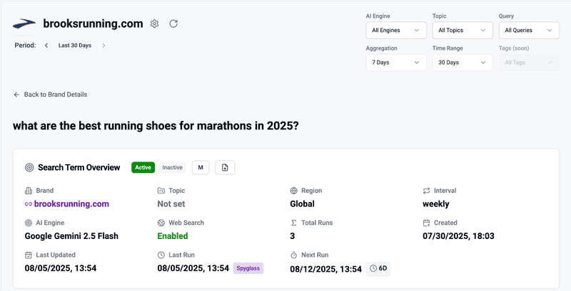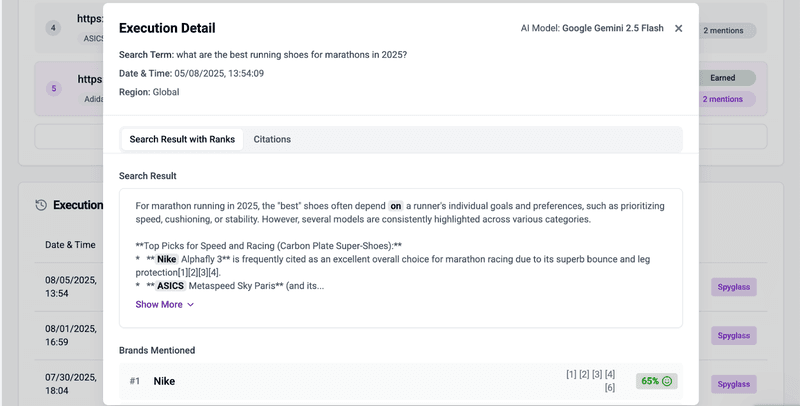 - Spyglass view to see exactly how AI engines like Perplexity present results for your chosen term