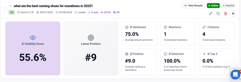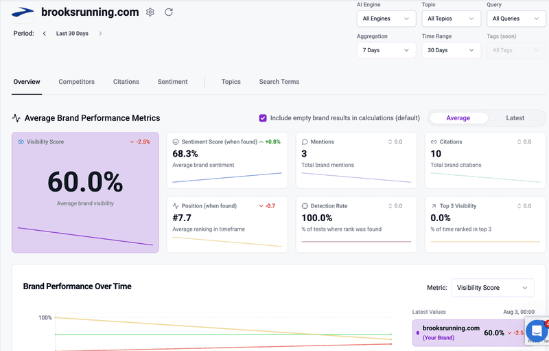 - Top 3 Visibility percentage: How often you show up in the top 3 AI answer spots