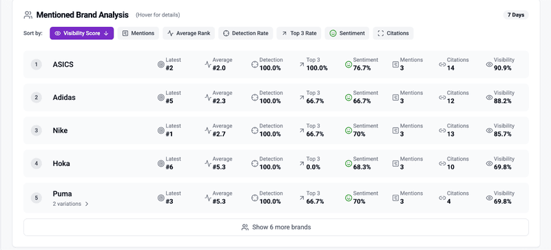 - Their visibility scores, sentiment ratings, and citation counts