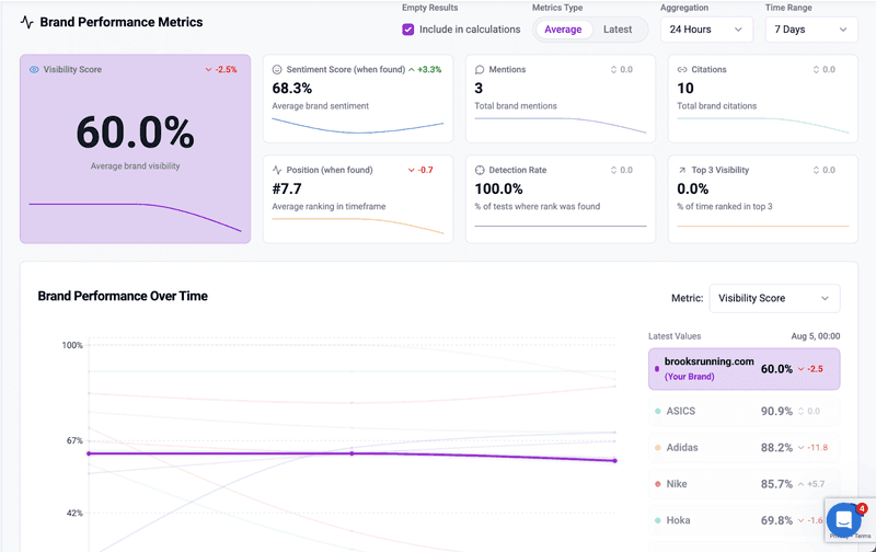 Since AI-generated results don’t rely on ranked lists or clicks in the same way as traditional search results, you’ll need to monitor AI-specific performance metrics to have a true picture of your visibility in LLM results.