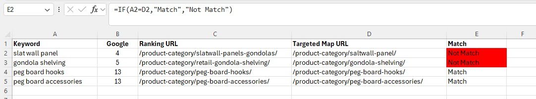 If you want to check across multiple pages, simply export a full keyword ranking report and compare the current landing page rankings with your intended URL map using a simple IF function in excel =IF(A1=B1,”Match”,”Not Match”). If they don’t match, there’s a high chance of cannibalisation.