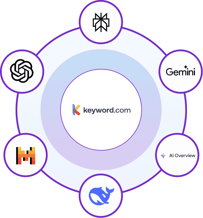 Keyword.com tracks your brand across major generative AI search platforms, including Google AI Overviews, Google AI Mode, ChatGPT, Gemini, Perplexity, DeepSeek, Mistral, and more. We’re constantly adding new platforms as AI search evolves.